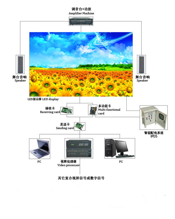 舞臺(tái)背景的要求隨著大屏幕LED顯示系統(tǒng)技術(shù)的提高,已越來越被編導(dǎo)們看好并運(yùn)用。大場景大畫面配合歌舞主體以達(dá)到渲染現(xiàn)場歡樂、熱烈的效果,使舞臺(tái)上下演員與觀眾融入一體,使觀眾身臨其境。、可將一個(gè)畫面切分為多個(gè)視頻畫面播出 、顯示屏可獨(dú)立、結(jié)合、任意組合使用播放相關(guān)大背景、大屏幕可根據(jù)演出需求分區(qū)顯示,并可實(shí)現(xiàn)圖文的迭加、背景畫面用視頻信號(hào)處理器播放或合成同一畫面顯示、可對(duì)人物特寫播放、可做文字滾動(dòng)播放、或插播播放、可水平推移視頻畫面屏風(fēng),也可上下升降成為文字、個(gè)性視頻畫面、亮化、美化舞臺(tái)背景及舞臺(tái)地面、通過軟件設(shè)計(jì)及系統(tǒng)控制來滿足視覺上的效果。 佳惠科技以全新方案解決目前舞臺(tái)LED花樣顯示其繁瑣控制及完成更多的特效等難題,可以根據(jù)現(xiàn)場擺設(shè)的不規(guī)則LED點(diǎn)陣,可以根據(jù)現(xiàn)場顯示環(huán)境效果的需要,通過控制軟件配置,實(shí)現(xiàn)變換多樣的顯示效果。