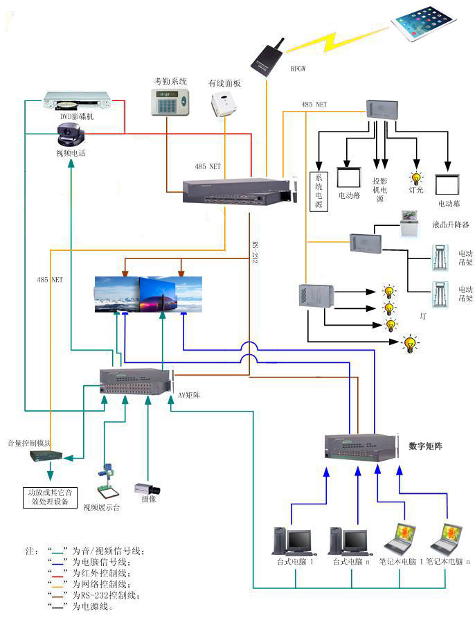 通過中控配合燈光控制器可對現場的燈光進行控制,音量控制,電源控制等。