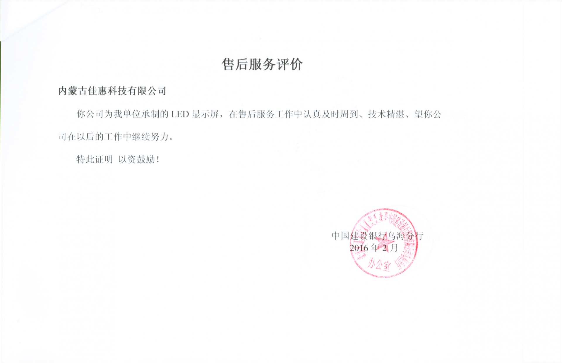 下一條中國建設(shè)銀行內(nèi)蒙古分行包頭優(yōu)質(zhì)服務(wù)證書