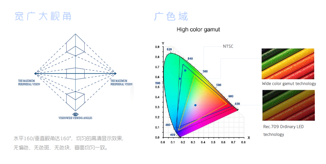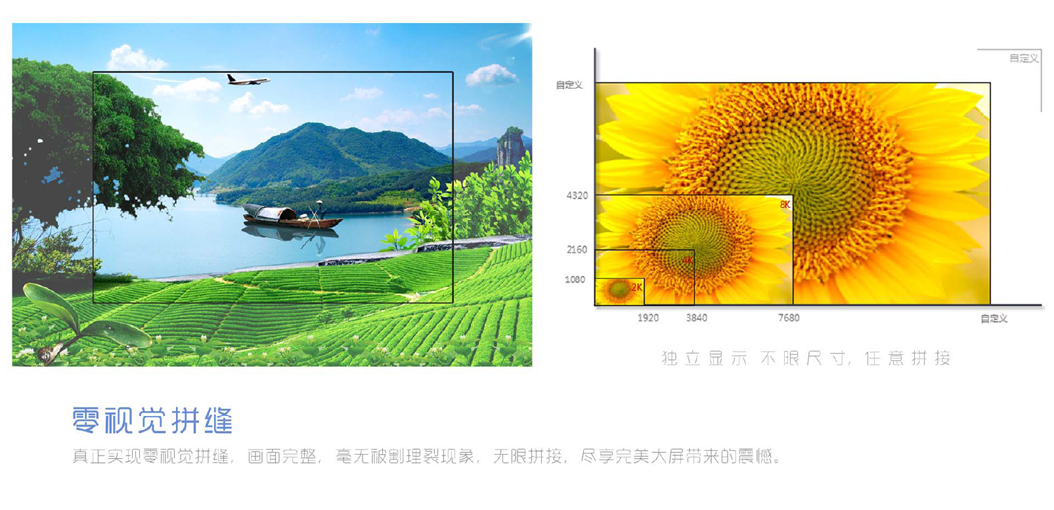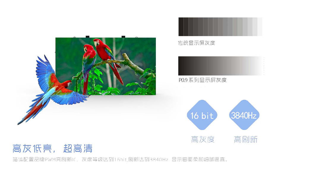 小間距P0.9LED顯示屏具有高刷新、高灰階、高亮度利用率、無殘影、低功耗、低EMI的特點,室內應用不反光;其輕便超薄、精度高,占用運輸及使用空間小、靜音且高效散熱。 可實現任意大小尺寸無縫拼接、模塊化維護。其播放的整個畫面色彩均勻,高清逼真,沒有普通顯示屏常見的汗斑、亮線等不正常顯示,畫面切換柔和不閃爍,畫質非常細膩,直逼電視機的播放效果。